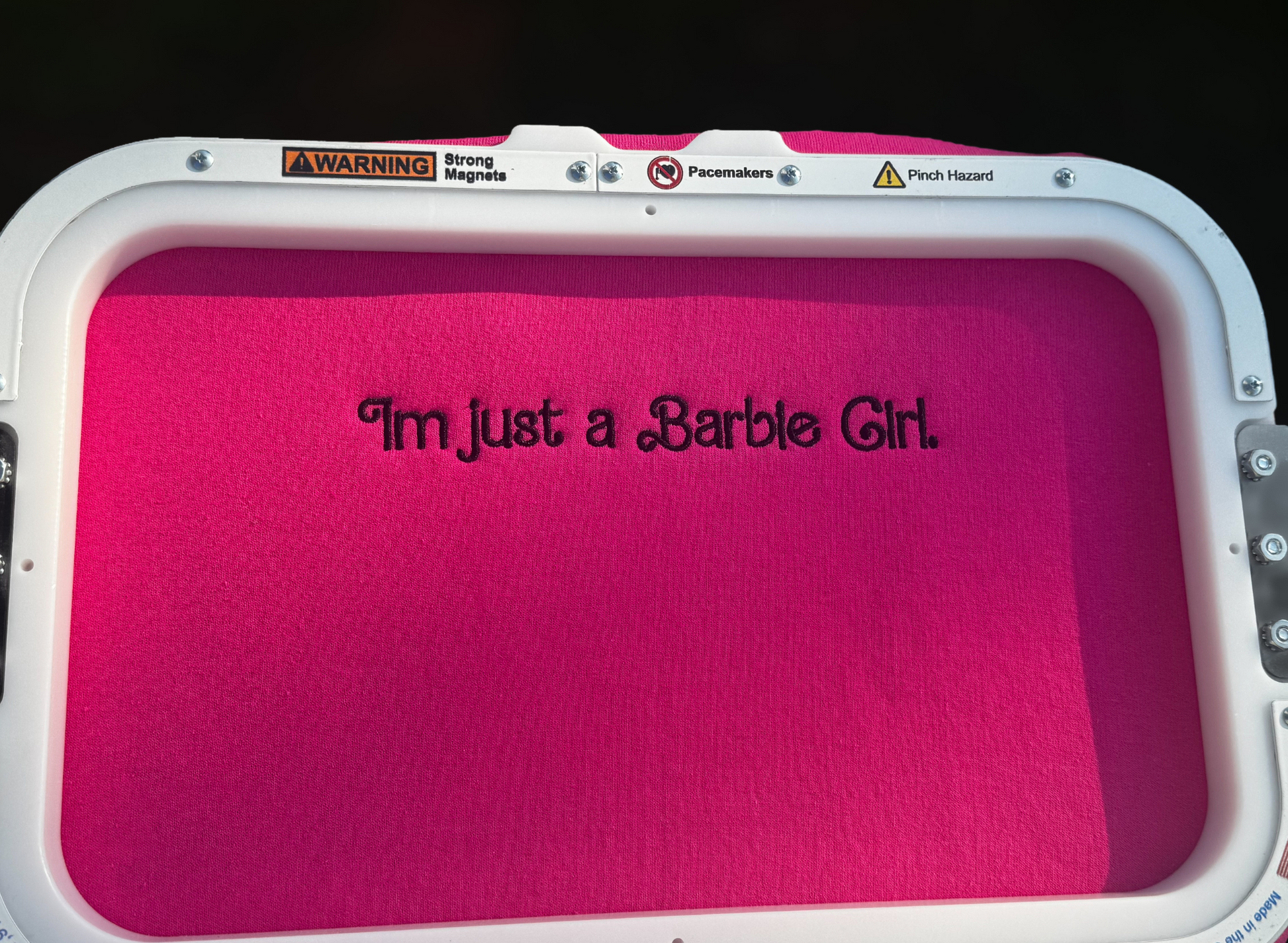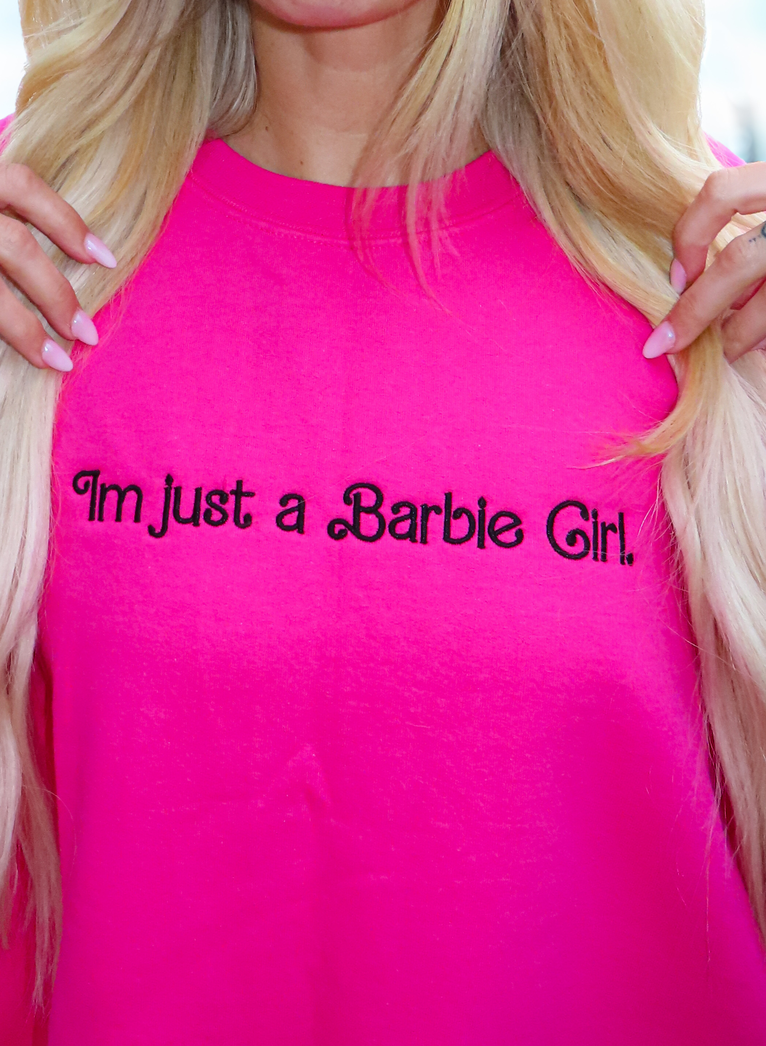 Light, sweet, and stitched with love—this light pink t-shirt features bold hot pink embroidery that says: “I’m just a Barbie girl.”💗