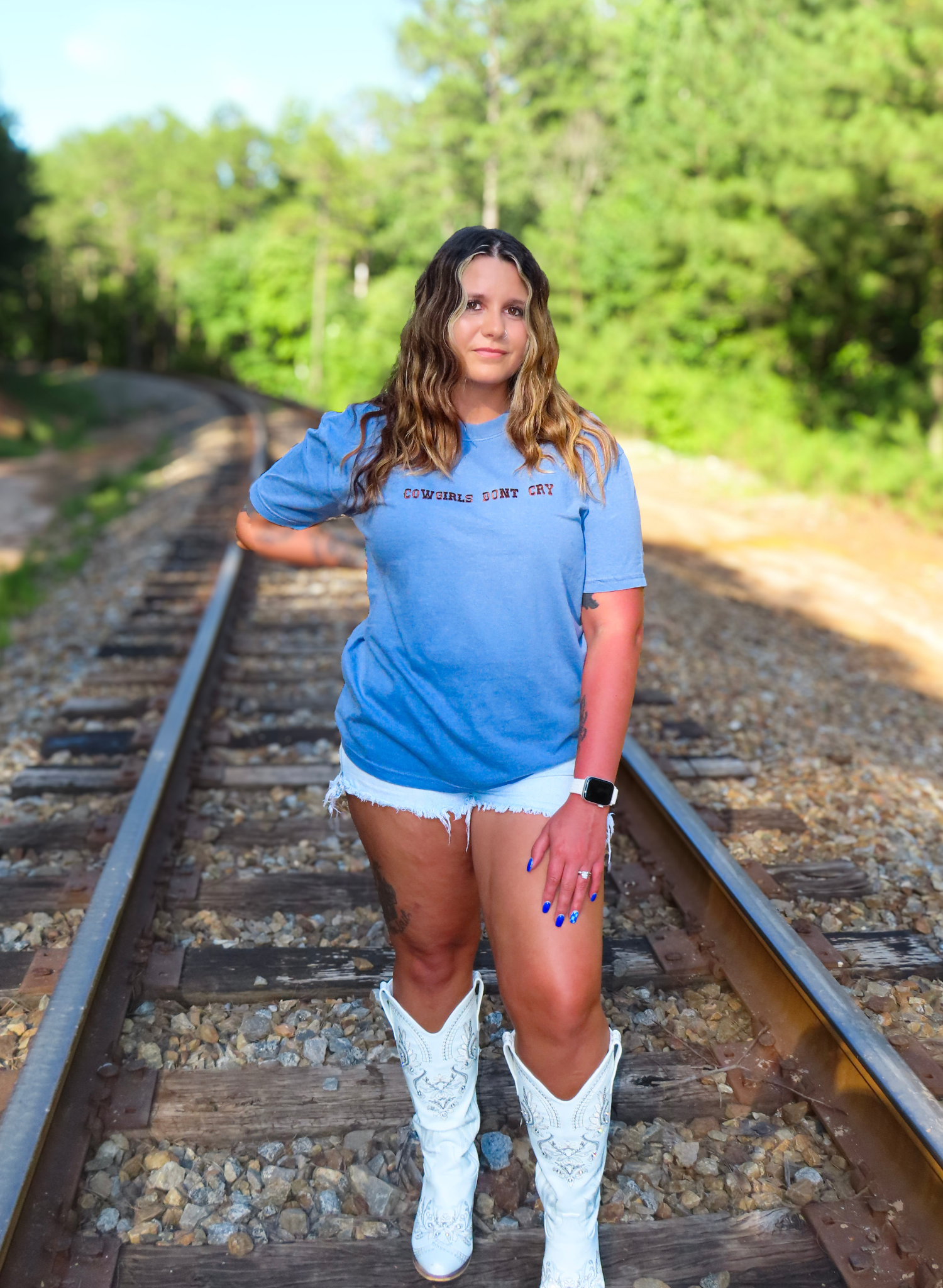 Inspired by timeless rodeo style, Cowhide Blues features a blue jean wash and rich brown embroidery. The “Cowgirls Don’t Cry” message is front and center in a saddle-stitched look that channels heritage cowgirl energy. From honky-tonk nights to sunrise chores, this tee was made for movement.