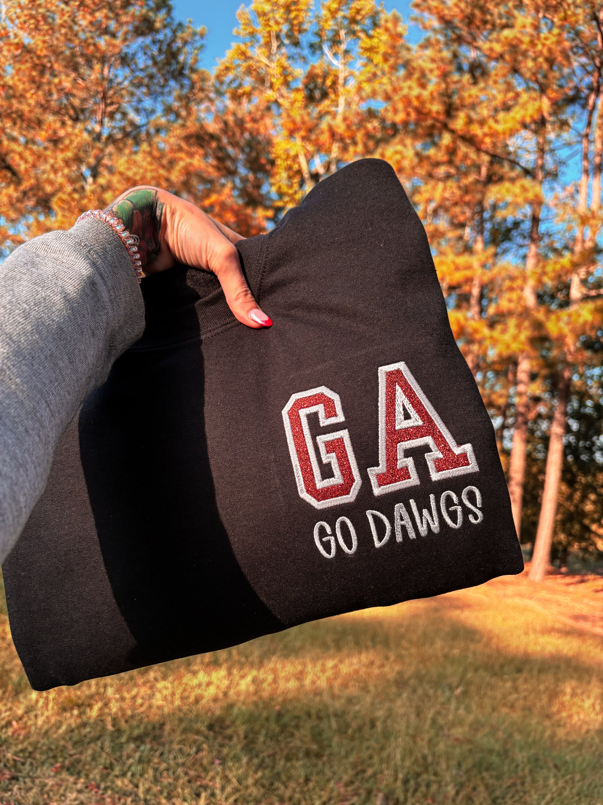 Rep your Georgia pride in style with our GA “Go Dawgs” Embroidered Sweatshirt—a cozy essential made for diehard Dawgs fans and comfort seekers alike.